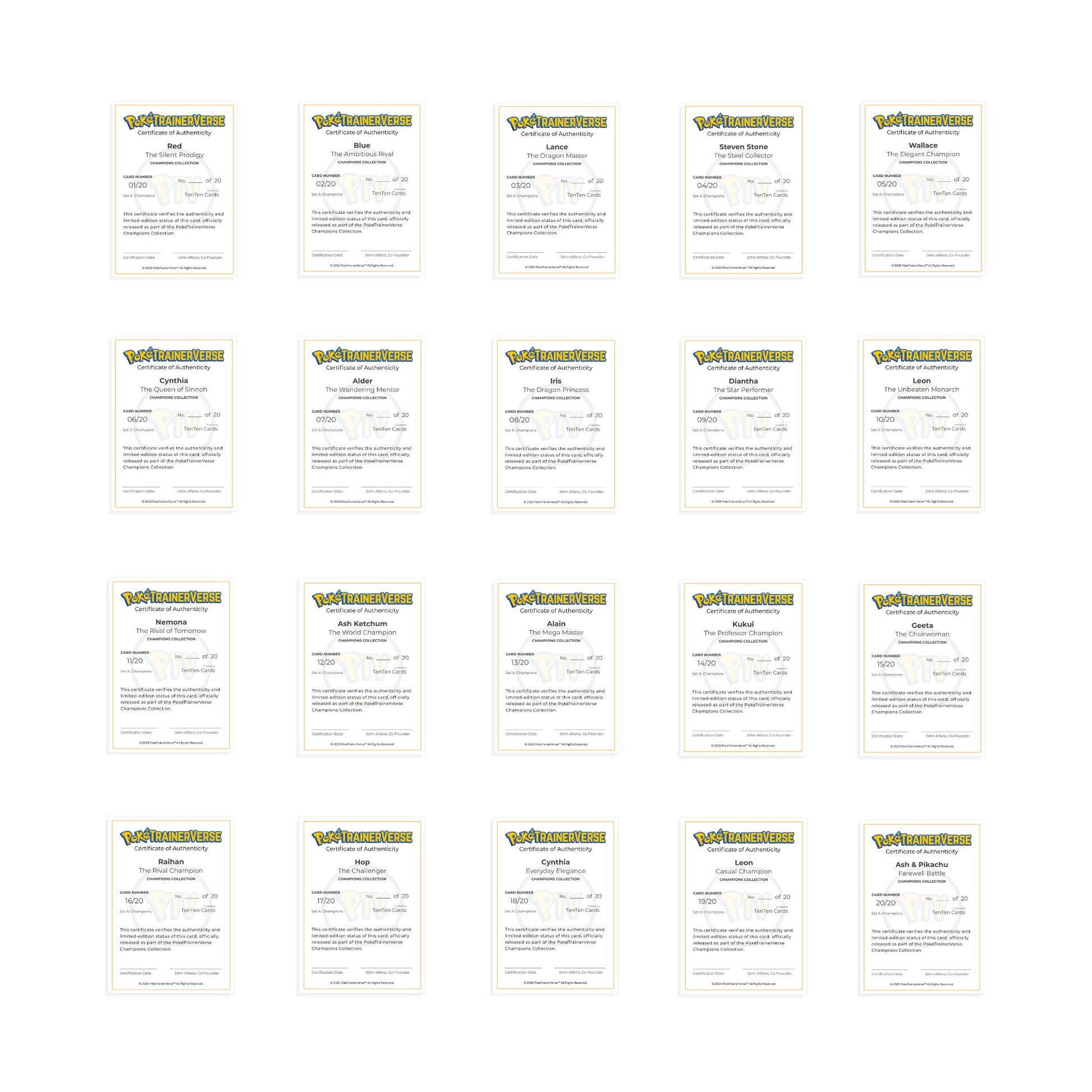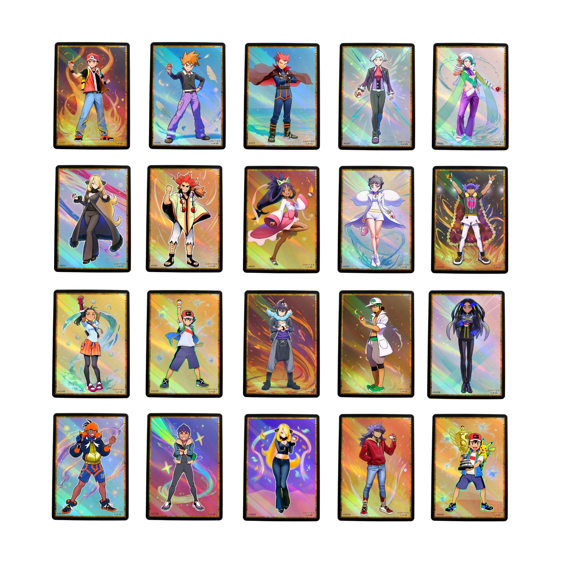 This complete Set A bundle includes all Champion cards from the Champions Collection, featuring legendary trainers from multiple regions—each captured in a distinct, collectible card format that celebrates their legacy, authority, and impact on the Pokémon world.